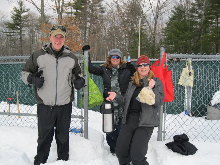 Be careful using a white softball as it may disappear. "Where did the ball go?" Or maybe she just wants to show off her derriere. We started out with a red, white, and blue softball, but since it got so wet we switched to the second ball which was all white. And yes, at one point four or five people were on the ground searching for a ball in two feet of white, cold snow.